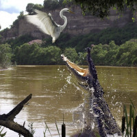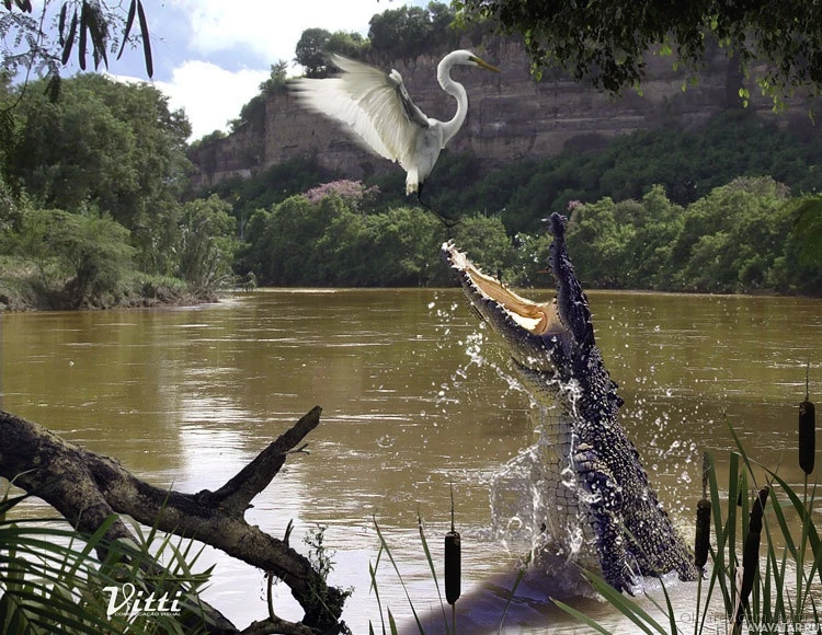 The image shows a scene where two alligators are in the water, and one appears to be trying to catch another bird. There is an additional bird flying over the scene. This image seems to be digitally manipulated or altered to create a whimsical or fantastical scenario that wouldn't occur naturally. It is not