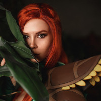 the video game Dota 2. She is holding a large plant, possibly