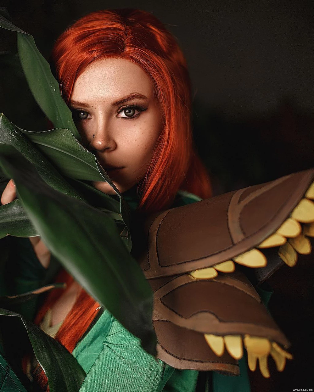 The image features a woman with red hair, wearing a costume that appears to be inspired by the character Windranger from