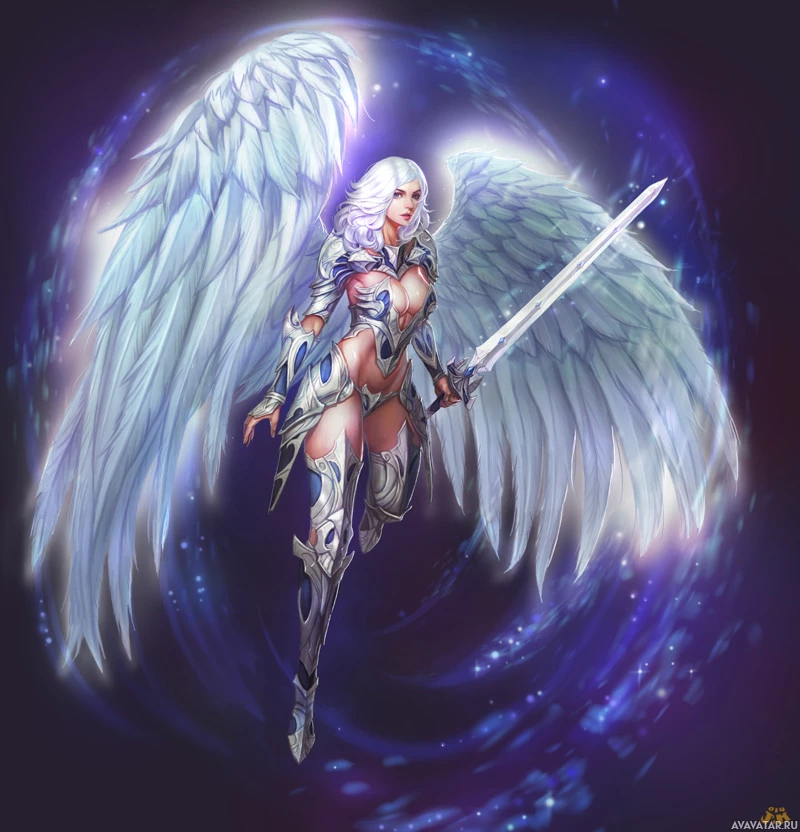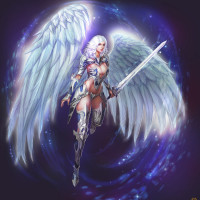female character with white hair, wearing armor and wings that resemble those of an angel or a fantasy creature. She is holding a sword in her right hand, suggesting she might be a warrior or fighter. The background has a magical or ethereal appearance, with blue and purple hues that could indicate