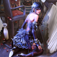 blue hair and is sitting on the floor with her back to the viewer, looking over her shoulder at the camera. The elf is wearing