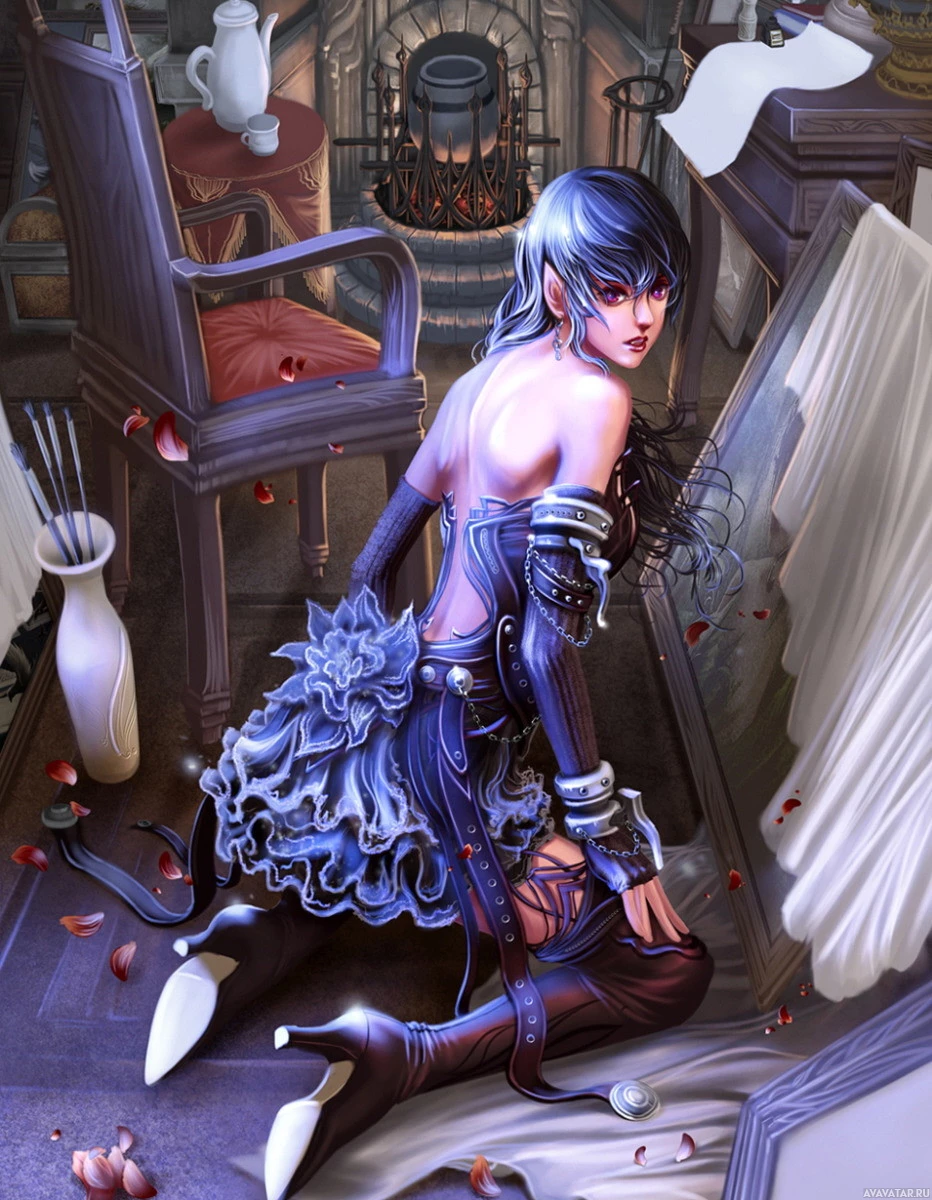 a dark dress that features a corset design and is adorned with what appears to be a magical or mystical element, possibly a jewel or crystal. There are red rose petals scattered around her, suggesting a romantic or enchanted atmosphere. Additionally, there's a small vase near her, which adds to the magical