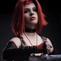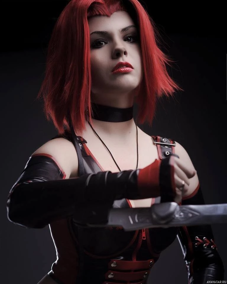 red hair and attire that includes leather or a similar material. They are holding a sword, which also appears to be inspired by Bloodrayne's weapons. This cosplay represents a close representation of the character's design from the series.