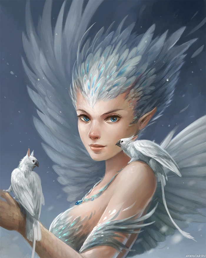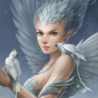 a female figure with pointed ears, suggesting an elf or fairy archetype. She has feathers on her head and is holding two small