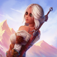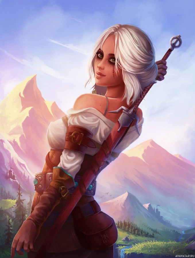a mountainous landscape, possibly indicating that the scene takes place in a wilderness or adventurous environment. The character appears to be Ciri from the "Witcher"