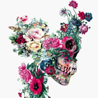 The image features a detailed and vibrant depiction of a skull adorned with an array of flowers. There are pink, purple, blue, yellow, and white flowers among