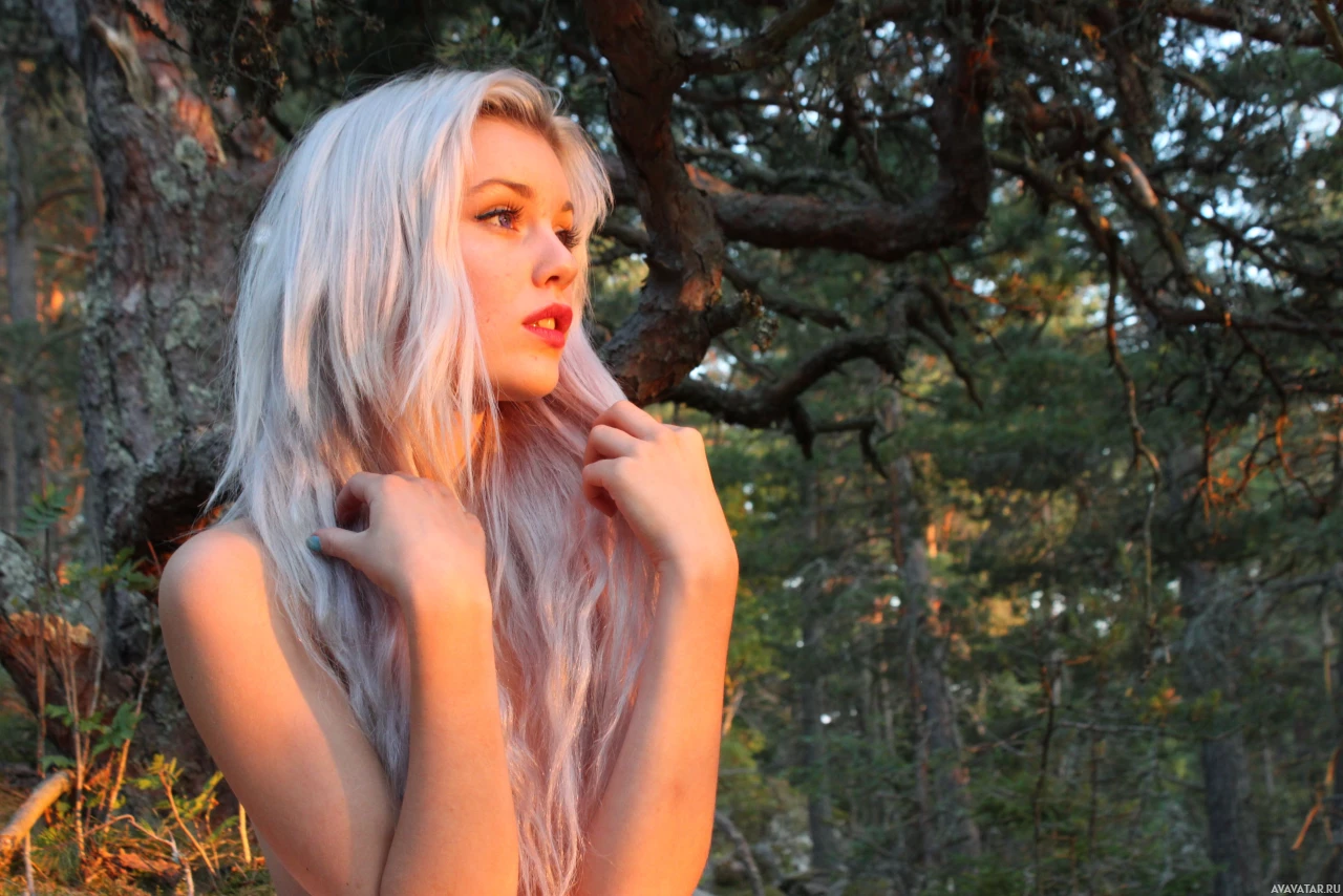 a young woman with white hair styled in a side parting. She is wearing makeup, including