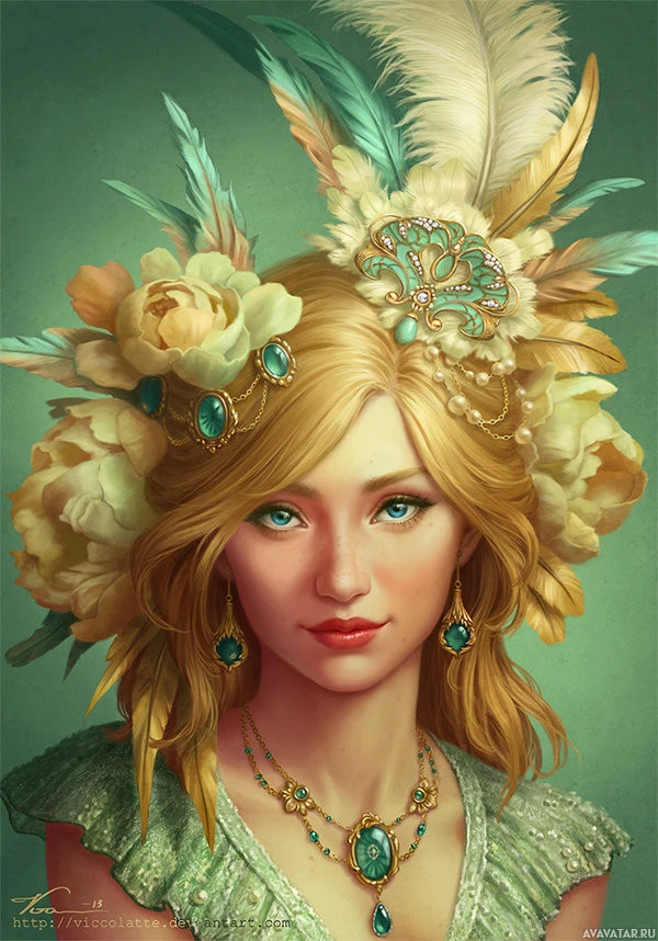 a neutral expression on her face and is looking directly at the viewer. The color palette includes greens, whites, and golds, creating an opulent and vintage-inspired look. The character's attire seems to be fashioned in a style reminiscent of historical or fantasy costumes, possibly suggesting a theme related to nature or aristocracy.