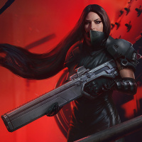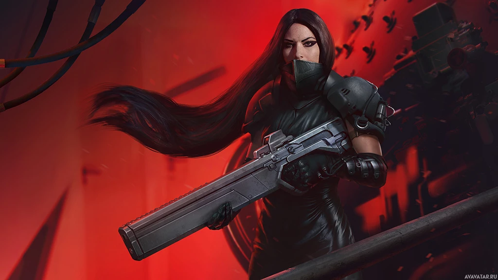 a female character with long dark hair, wearing what appears to be a futuristic or science fiction-inspired armor. She has a gun in her right hand and is standing against a backdrop that looks like a war-torn or destruction scene, possibly from