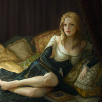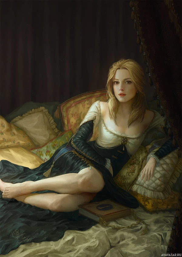 long hair, lying on her side on a bed. She appears to be in a historical or fantasy setting, dressed in what could be interpreted as medieval clothing or fantasy attire, suggesting she might be a character from a story or