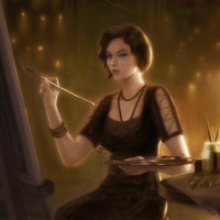 art supplies on the table before her, including paintbrushes and canvases. The