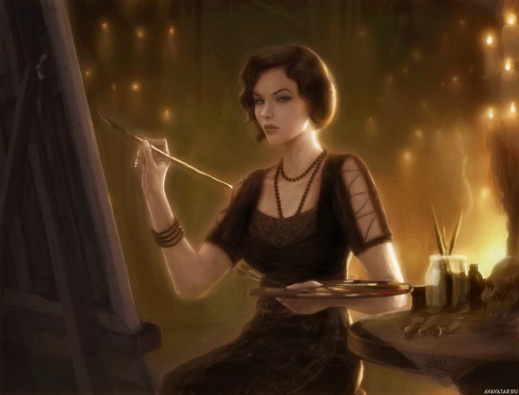 The image features a woman sitting at an easel, engrossed in painting. She has