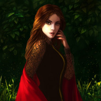The image shows a woman with red hair wearing a black and gold dress. She has her hand on her chin, suggesting a thoughtful or contemplative pose. The background is a forest setting with misty greenery, which gives the scene an enchanting atmosphere.