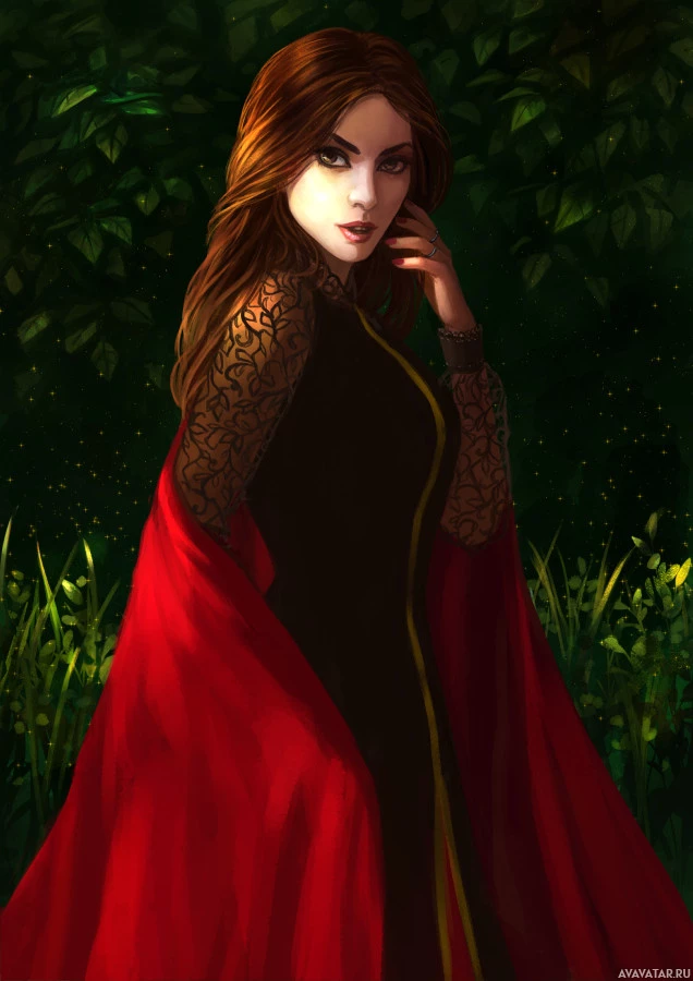 На снимке изображена женщина с рыжими волосами в черном и золотом платье. Она держит руку на подбородке, предлагая задумчивую или созерцательную позу. Фон — лесная обстановка с туманной зеленью, которая придает сцене чарующую атмосферу.