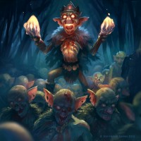 menacing expression and is holding what appear to be lit torches in its hands, suggesting it might be in a setting where fire or light is useful or required. Surrounding the goblin are numerous zombie-like creatures, which could indicate that this character is either controlling or battling these