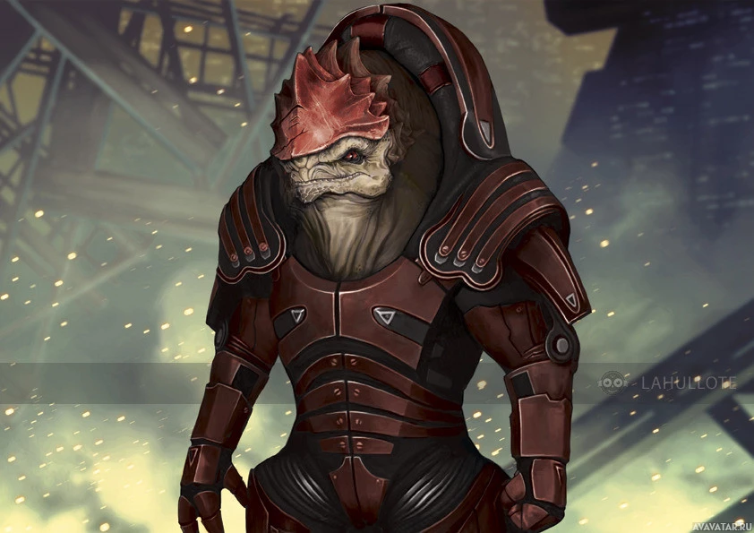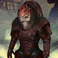 a humanoid species known for their strength and resilience. In this particular artwork, the Krogan is depicted wearing armor and looking somewhat stern or serious.