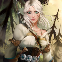 a female character from the video game "The Witcher 3: Wild Hunt." She has long white hair and is wearing what appears to be a medieval-style outfit, with visible armor pieces and clothing that suggest