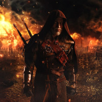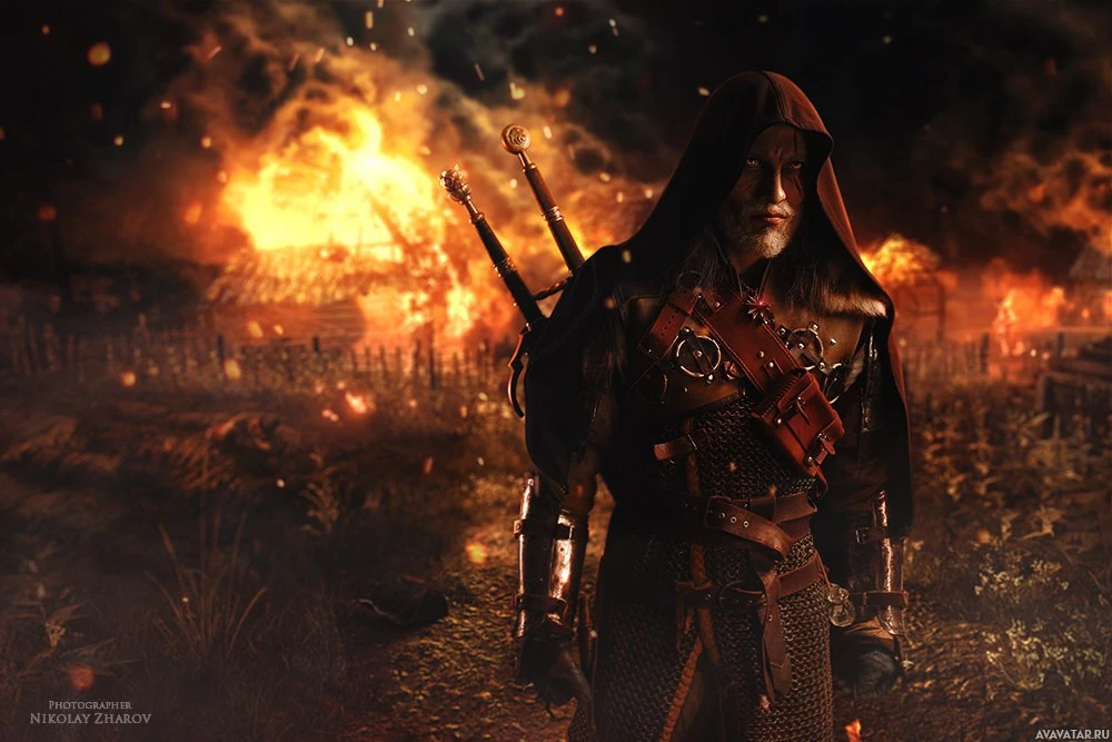 Geralt of Rivia, and he is depicted in his signature hooded outfit, which often features intricate patterns and embellishments. He is standing amidst