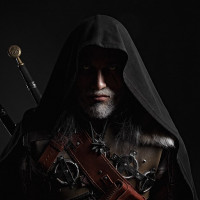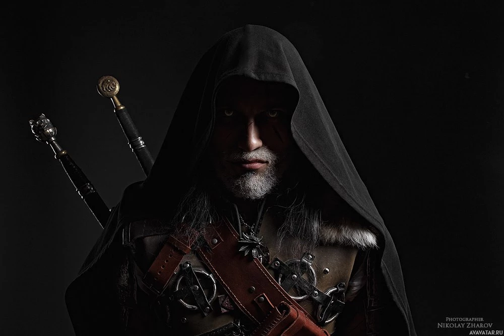 a hooded cloak and holding what appears to be a sword and shield, typical attire for a witcher. The costume is detailed, suggesting that this could be a cosplay or promotional image related to the game or franchise.