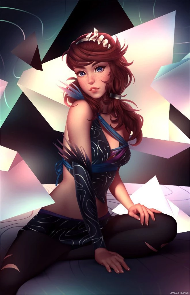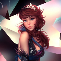 intricate designs and what appears to be a wing or feather-like accessory on her left shoulder. The background has abstract elements, such as triangular shapes in