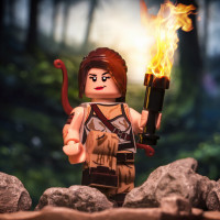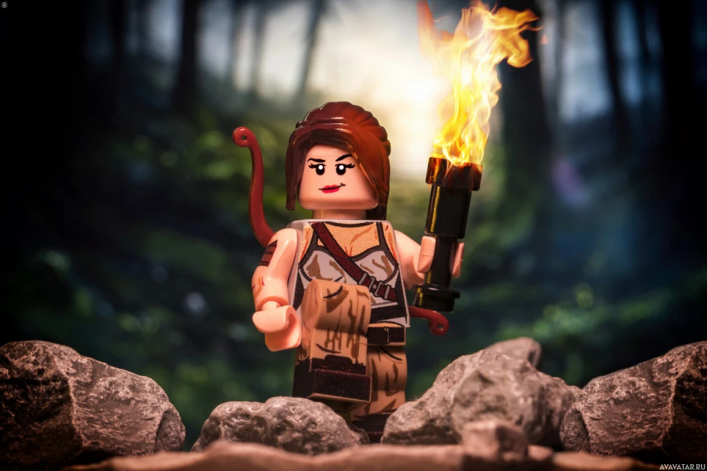The image features a Lego figure that has been edited to resemble the character of Lara Croft from the "Tomb Raider"