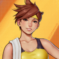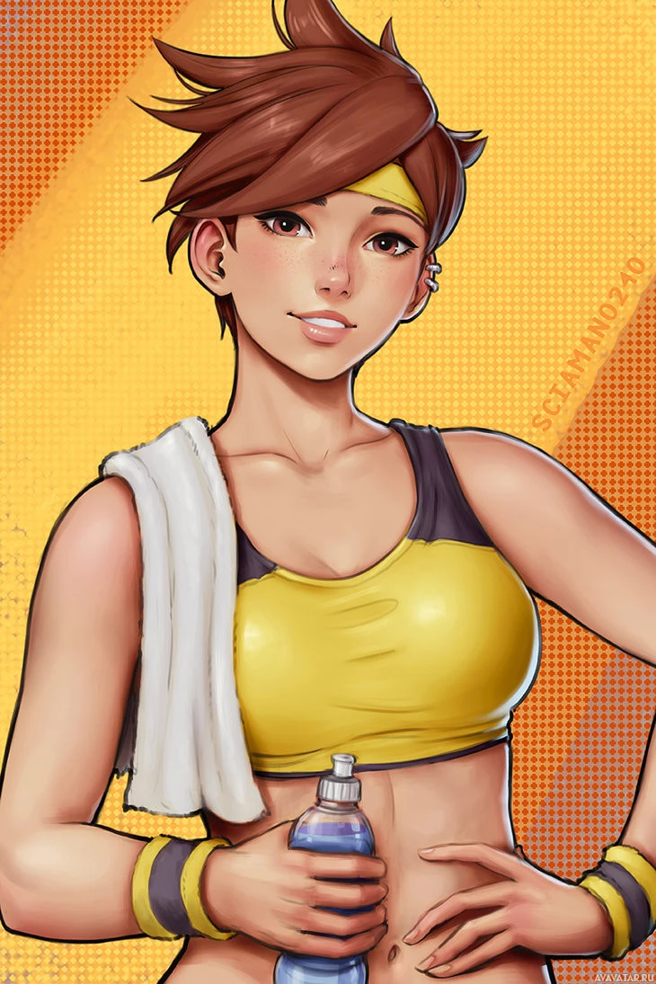 На картинке изображен иллюстрированный персонаж, который, кажется, вдохновлен игрой «Overwatch». Этот персонаж имеет короткие волосы и носит желтый и черный спортивный наряд, который предполагает, что они, вероятно, разработаны как спортсмен или фитнес-ориентированный персонаж. Стиль иллюстрации красочный и мультяшный, типичный для видеоигр.