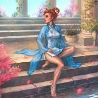 a female character with red hair. She appears to be sitting on some steps in an environment that looks like springtime, possibly inspired by East Asian architecture. The character is wearing traditional East Asian attire, which suggests a cultural or historical context for her appearance. The overall mood of the image is serene and picturesque, evoking