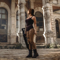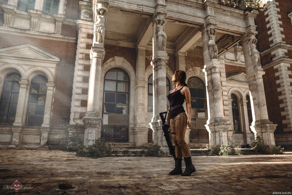 an architectural structure that appears to be in a state of disrepair. She is dressed in what looks like military-style clothing and boots, with a gun holster on her hip, which suggests she might be portraying the character Lara Croft from