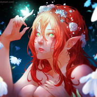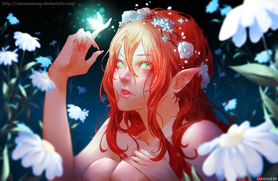 red hair, described as having an elf-like appearance. The character is standing among flowers and seems to be interacting with one of them, possibly blowing it away or touching it gently. They are adorned with