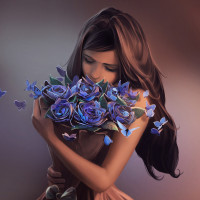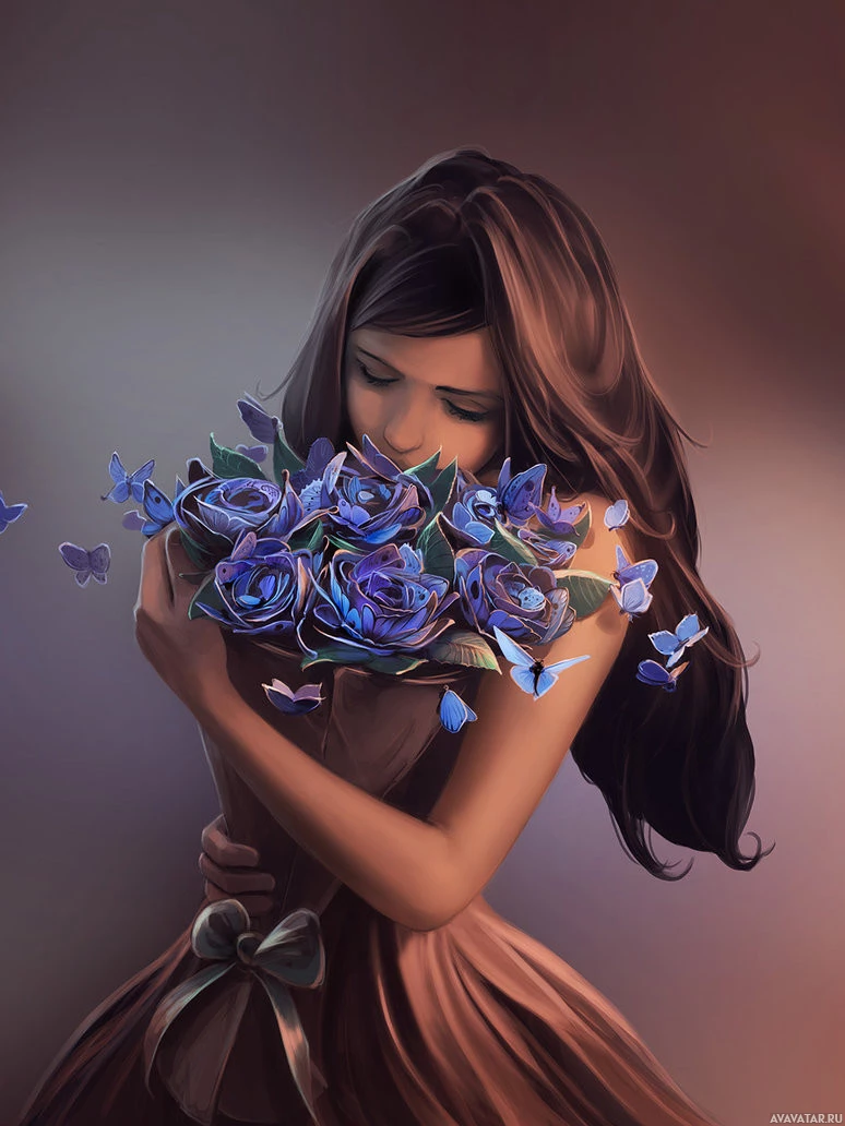 На картинке изображена молодая девушка с закрытыми глазами, держащая букет синих цветов. Она находится в состоянии расслабления или, возможно, испытывает аромат цветов. Вокруг нее водятся бабочки, добавляющие к сцене ощущение спокойствия и умиротворения. Общее настроение картины спокойное и созерцательное.