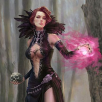 На картинке изображен женский персонаж с рыжими волосами, одетый в одежду в стиле фэнтези, которая включает темную одежду с элементами готического или фэнтезийного дизайна. Она держит то, что кажется волшебной палочкой или посохом, и перед ней череп на земле. Сцена выглядит как лес или лес, добавляя мистическую атмосферу к сцене.