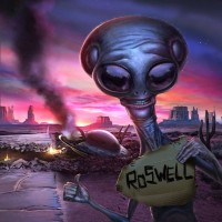 a desert landscape with a sign that says "Roswell, NM" and the alien is making a peace sign with one hand. It seems like this could be related to the Roswell UFO incident, which is a widely publicized event where an unidentified