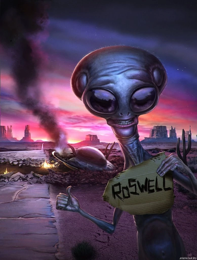 flying object purportedly crashed in Roswell, New Mexico, in 1947. The image uses humor and pop culture references to depict this well-known event with
