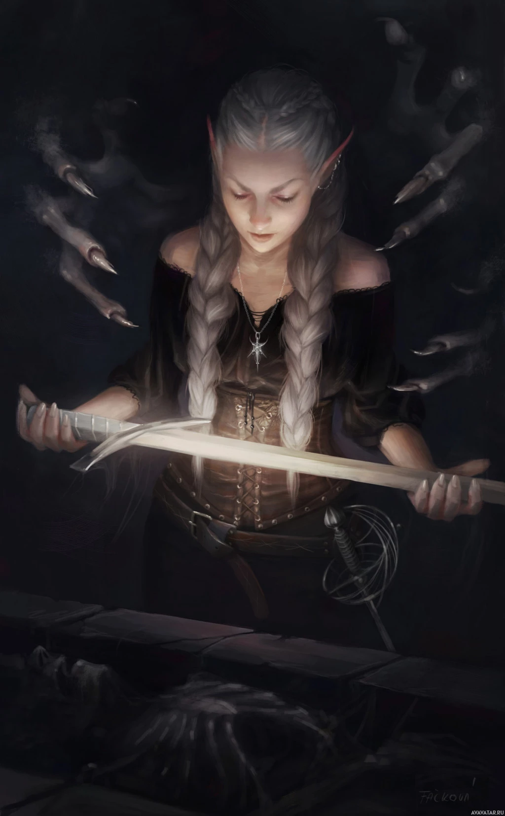 braided hair, closed eyes, and is holding a sword with both hands while it's resting on a stone or brick surface that appears to be her workstation. There are