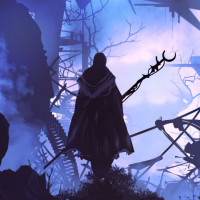 a fantasy scene with silhouettes of two figures. One figure is in the foreground, dressed in a cloak and holding what appears to be an object or weapon that resembles a staff or rod. This figure is looking towards