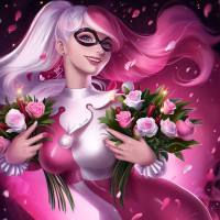 Harley Quinn from the DC Comics universe. She is depicted in a stylized manner and is dressed in a costume that matches her theme. In her hands, she holds flowers that are pink, which matches her hair color and adds to the overall aesthetic of the illustration. The background has a dark, almost