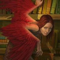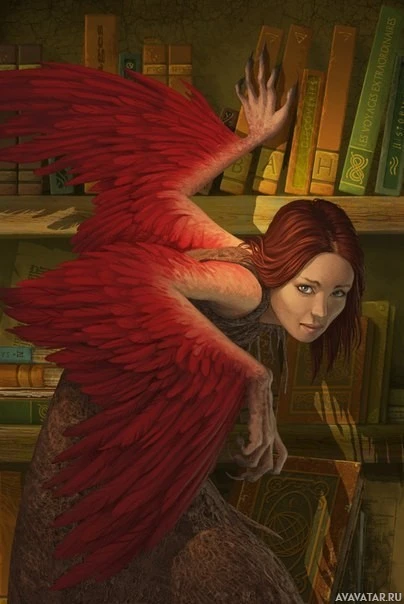red wings and feathered skin, perched on a shelf filled with books. She has