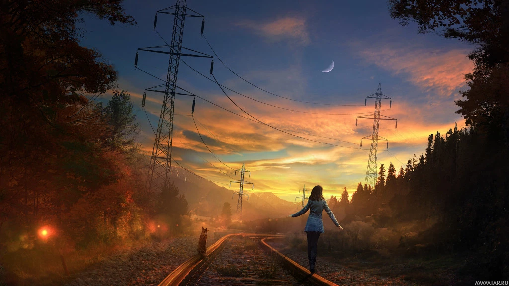 a railway track. The setting appears to be a forested area during either sunrise or sunset, as indicated by