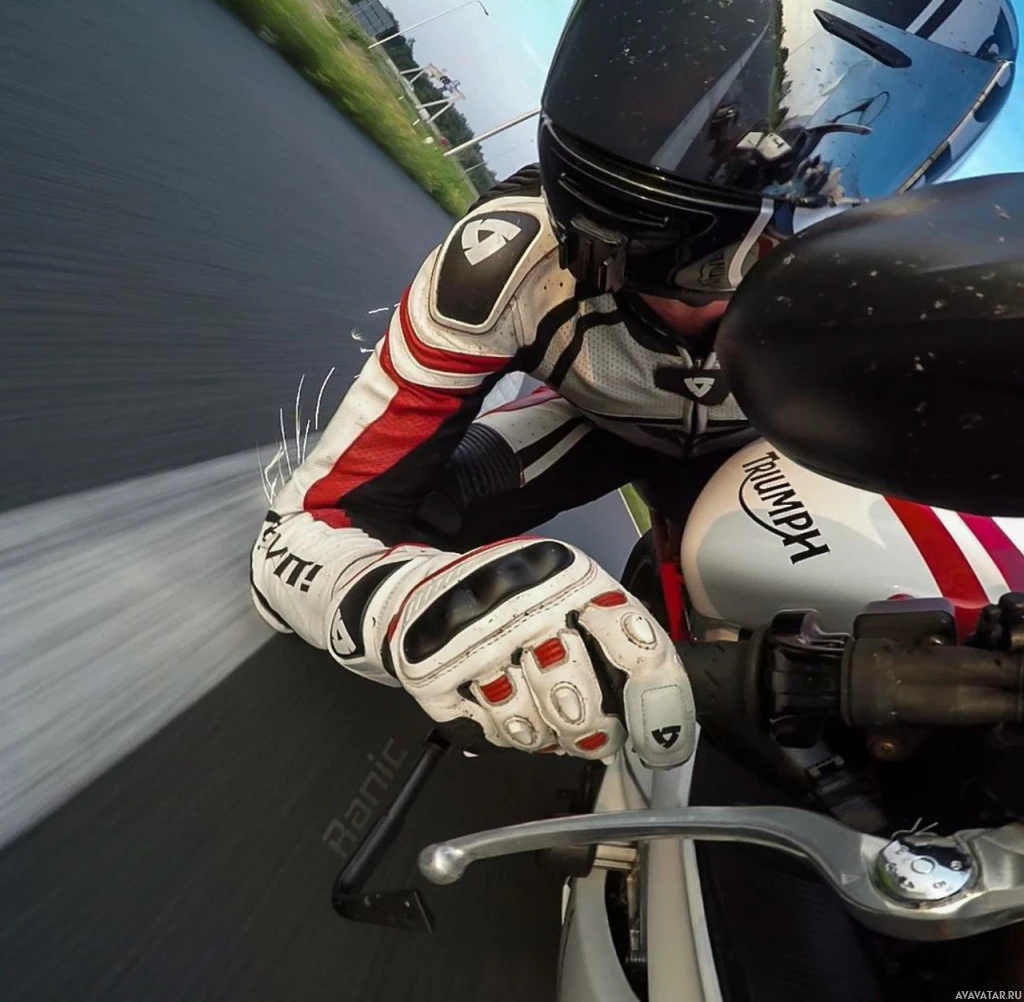 protective suit and a helmet, indicating they are likely participating in some form of motorbike racing or riding. The rider's hands are firmly on the handlebars, and their body leans into the turn, suggesting movement at