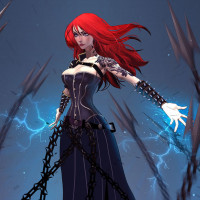 a dynamic pose, as if she's controlling or manipulating something around her. There are dark, spiky elements emanating from what looks like an electrical charge or