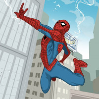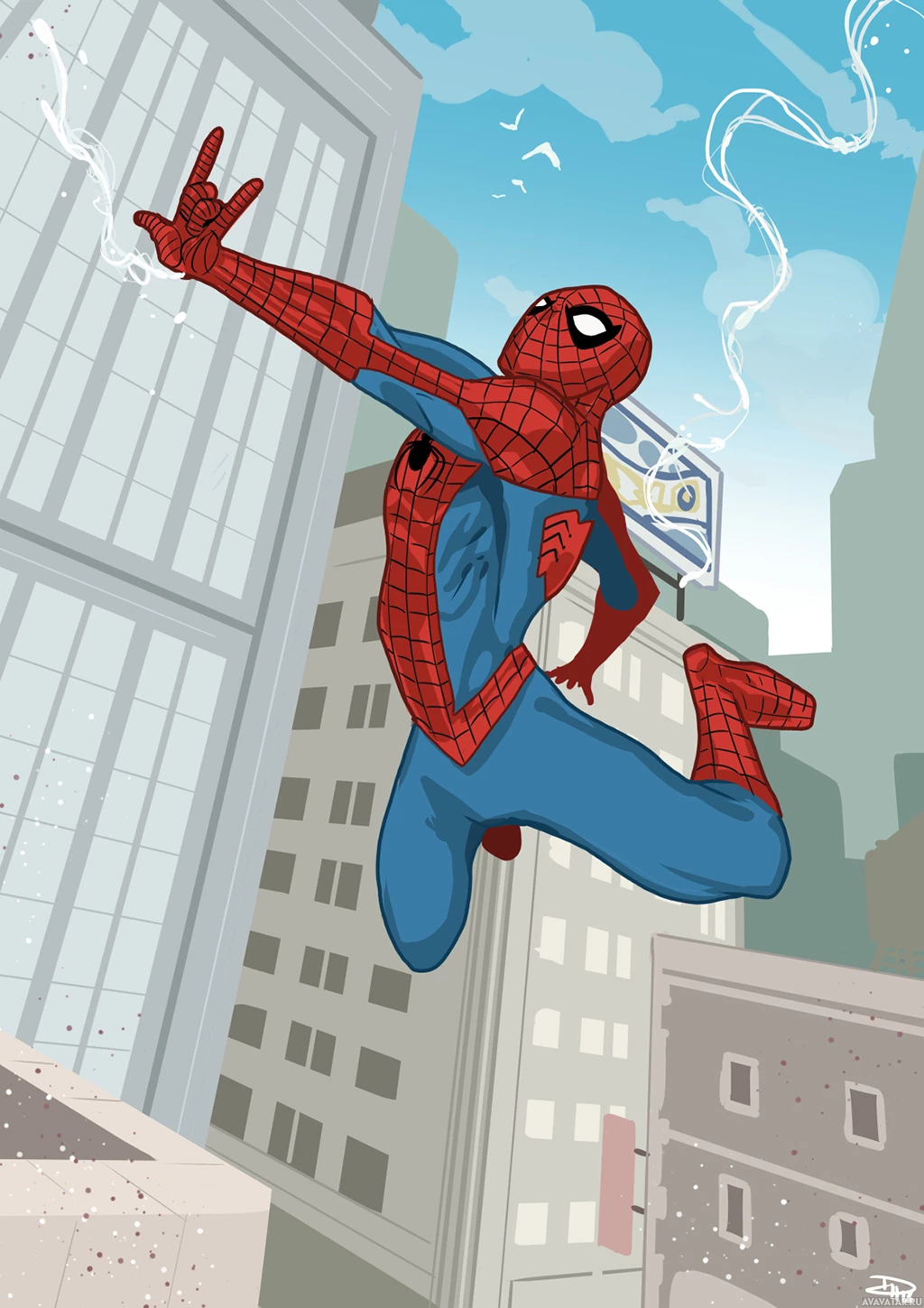 a superhero pose. He is dressed in his iconic blue and red suit with the spider