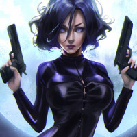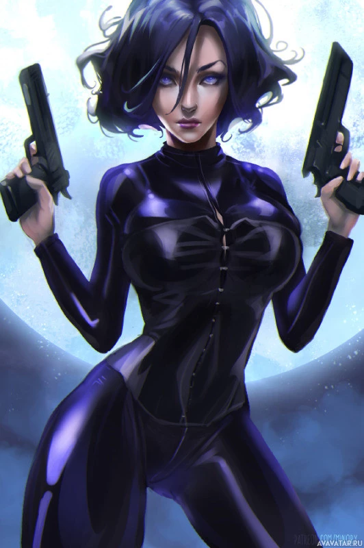 На картинке изображен иллюстрированный персонаж женщины, одетой в фиолетовый латекс. У нее поразительные синие волосы и она держит две пушки обеими руками, как будто готова стрелять или защищаться. Фон предполагает ночную обстановку под лунным светом, добавляя драматическое чутье к ее внешности.
