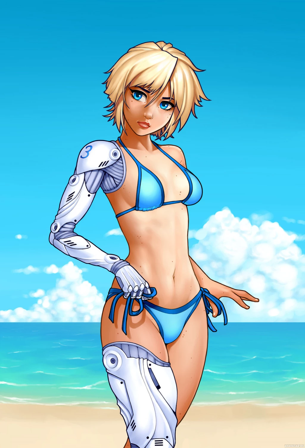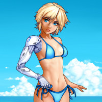 The image depicts an animated character who appears to be a girl with blonde hair. She is wearing blue swimwear and has robotic arms, suggesting that she might be a character designed for a science fiction or fantasy setting. It's important to note that this character is not real but created through digital art techniques.