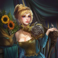 a small table or surface nearby. On the table, there are some flowers and what appears to be a vase with sunflowers. The setting suggests a cozy or intimate atmosphere, possibly indicating that this character enjoys reading or has