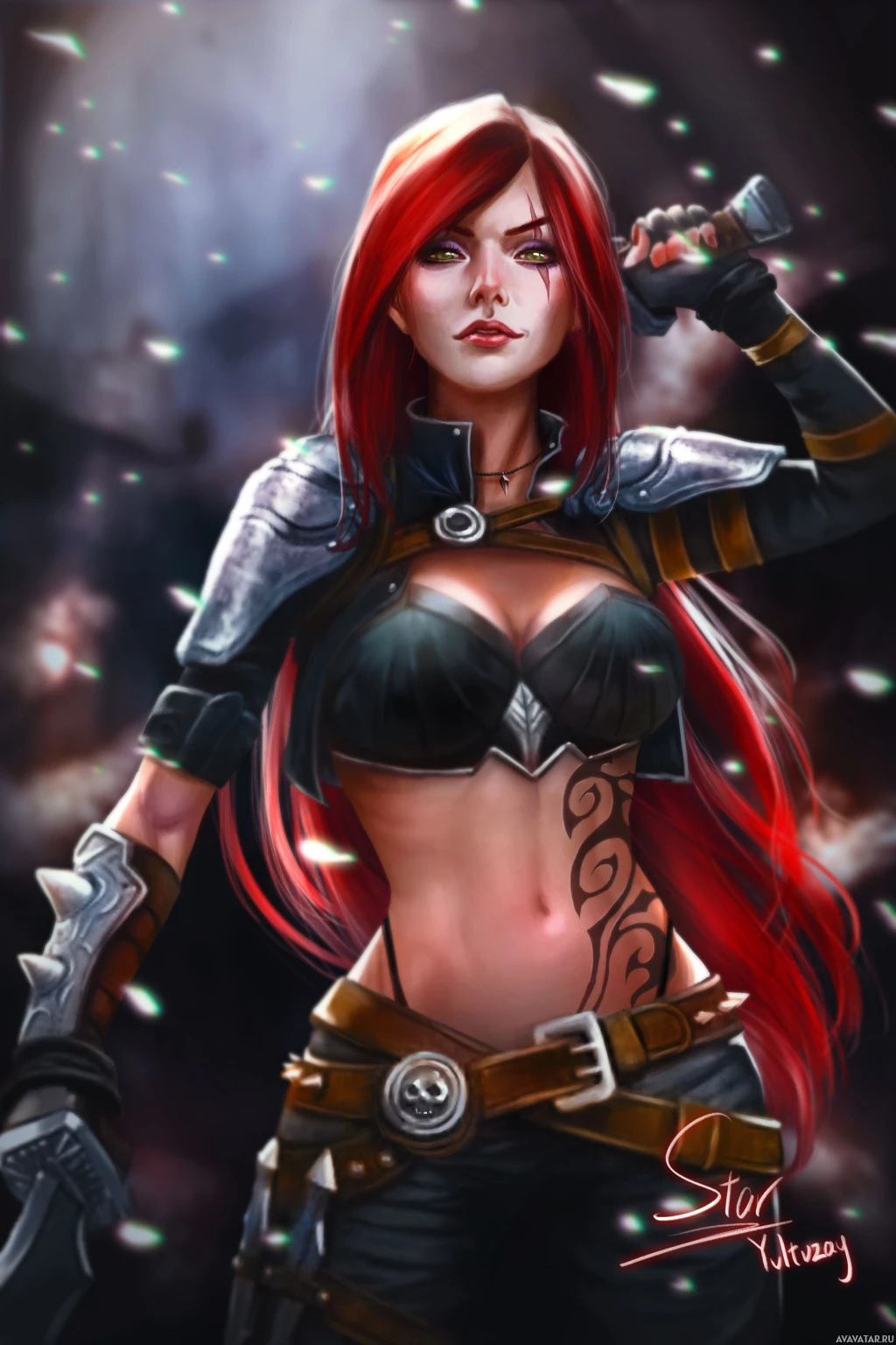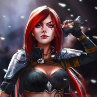 red hair, is wearing a black outfit with a leather-like design and armor elements on her chest, shoulders, and arms, and appears to be holding a sword or similar weapon in her right hand. Her expression suggests determination or focus, which might fit the personality of a character from a game like "