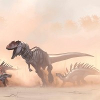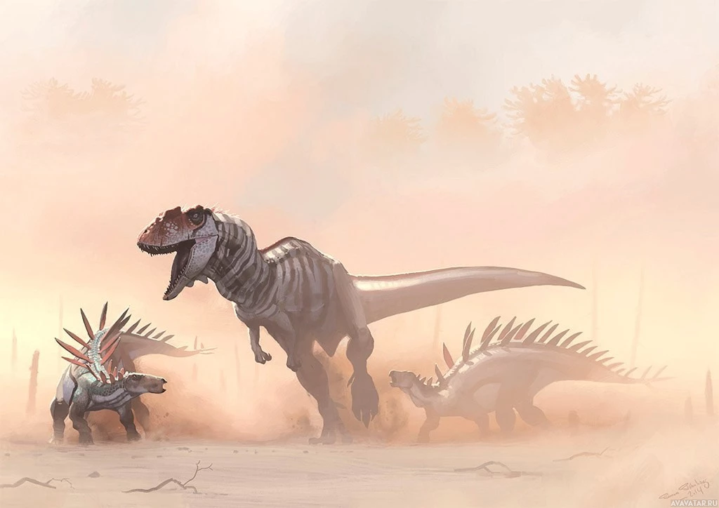 an artistic rendition of dinosaurs. There are two main figures: one that appears to be a Velociraptor, characterized by its spiky tail and aggressive posture with