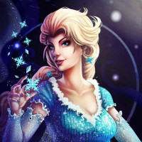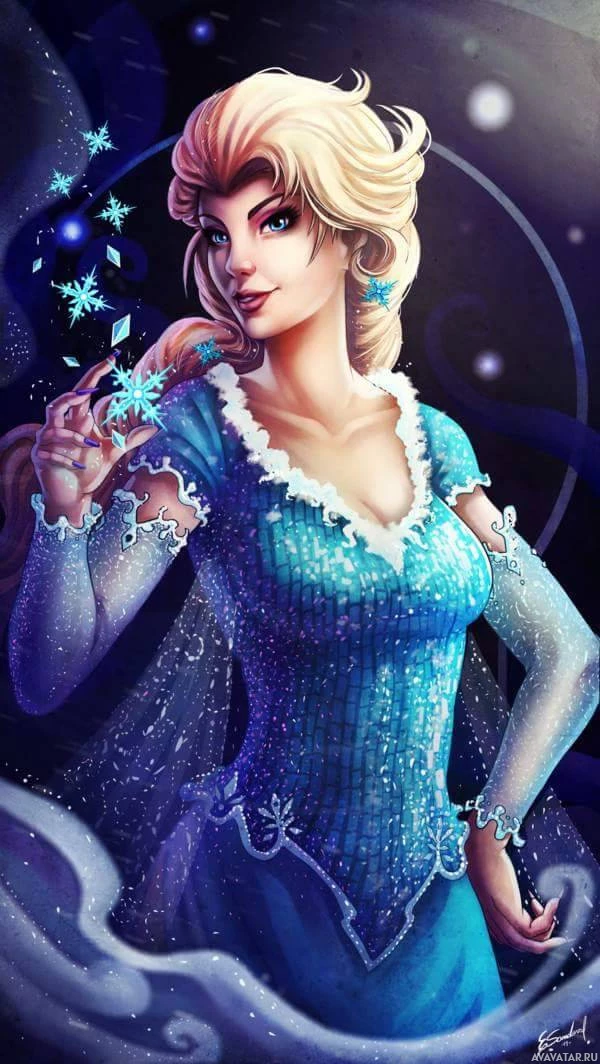 The image shows a digital artwork of Elsa, a character from the animated film "Frozen." She is depicted in her