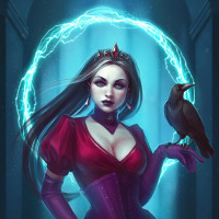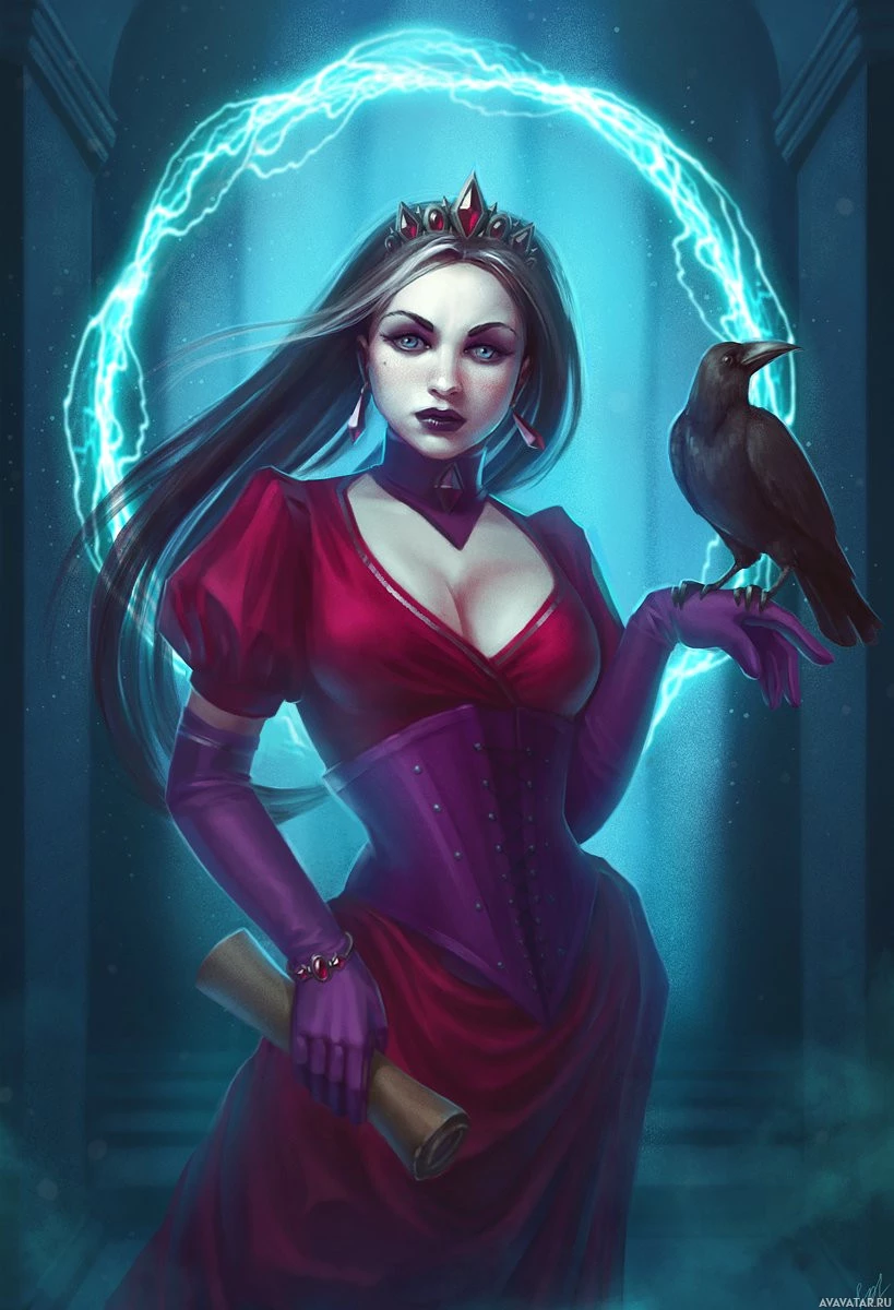 circular emblem at her chest, possibly indicating some form of magical or royal status. In one hand, she holds a black raven perched on her fingers, which may symbolize wisdom or the supernatural in