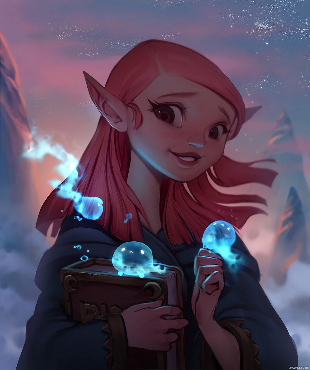blue spheres floating above a book she holds with both hands. The background suggests a fantasy environment with mountains and clouds, enhancing the magical atmosphere of the image.