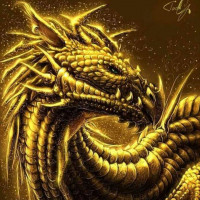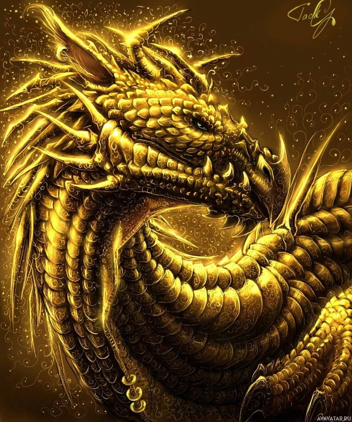 a serpentine body, elongated neck, wings, and what appears to be golden scales or armor, suggesting it may have a special role or power in the context of its storyline. The dragon is set against